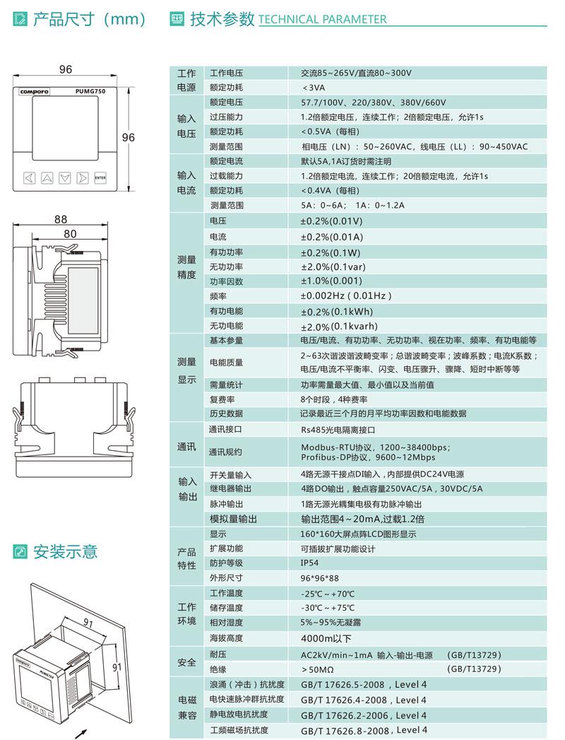 PUMG750是遵循國際電能質量標準而推出的新一代高端電能質量分析儀表,監測所有電能質量參數,如閃變,記錄電壓短時中斷,諧波最高至63次的測量分析。