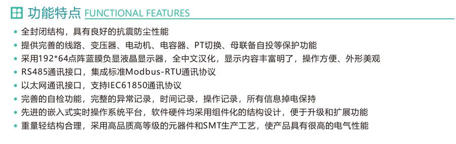 2.提供完善的線路、變壓器、電動機、電容器、PT切換、母聯備自投等保護功能