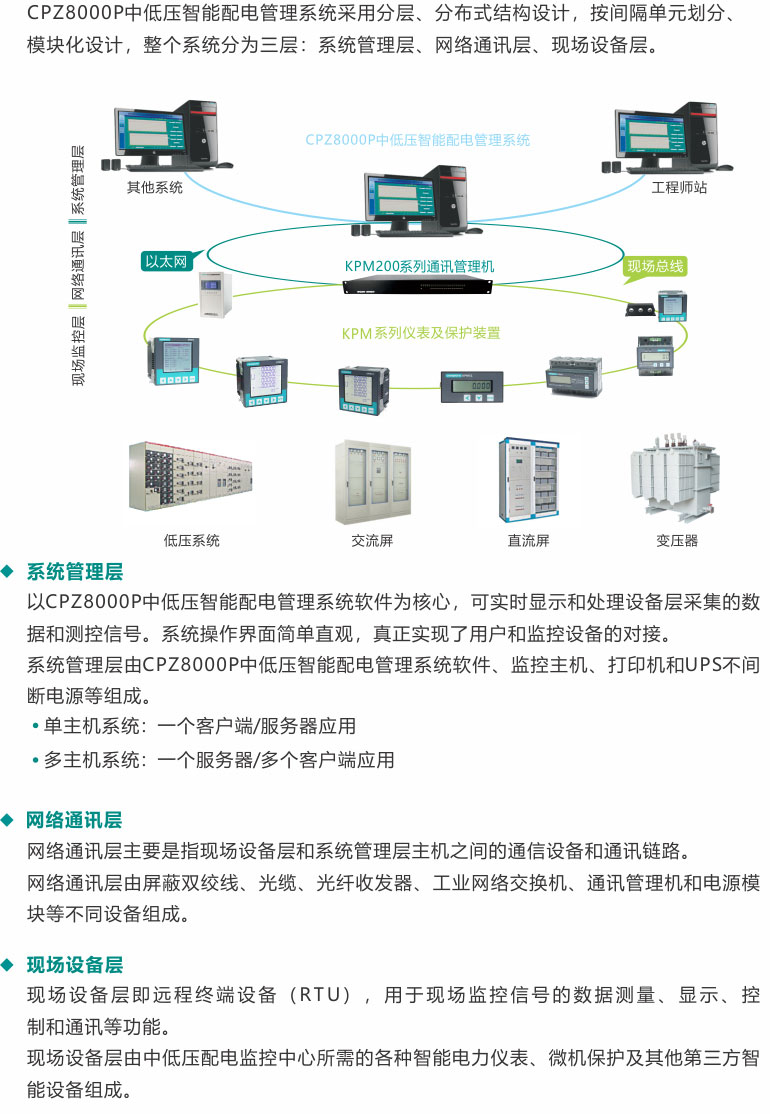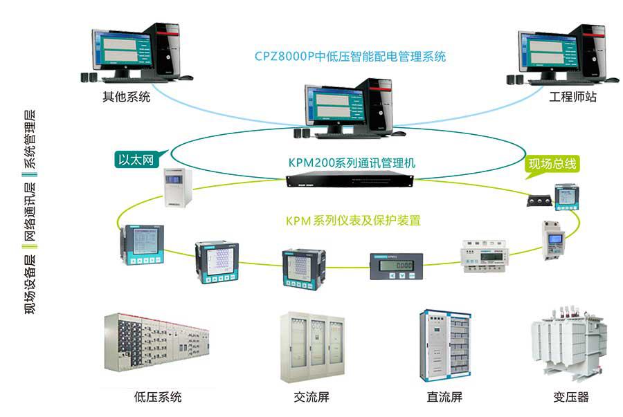 CPZ8000P中低壓智能配電管理系統采用分層、分布式結構設計,按間隔單元劃分、模塊化設計,整個系統分為三層:系統管理層、網絡通訊層、現場設備層。