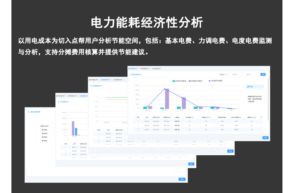 電費(fèi)優(yōu)化管理系統(tǒng),能夠解決采用兩部制電價的大工業(yè)用電企業(yè)容需電費(fèi)分析(基本電費(fèi))、分時電費(fèi)分析(電度電費(fèi))、力調(diào)電費(fèi)分析等電費(fèi)優(yōu)化問題,提供度電成本核算、降費(fèi)潛力分析、優(yōu)化建議、變損分析、負(fù)荷特性分析等多維度分析方案,并自動生成月度電費(fèi)優(yōu)化報告,讓大工業(yè)用戶的電費(fèi)管理更加科學(xué)合理!