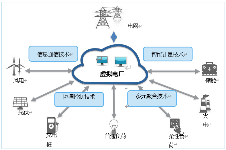 通過智能調(diào)控、通信技術(shù)整合各種形式的分布 式發(fā)電、負荷、儲能等資源,作為一個調(diào)控性能好的“虛擬電廠”來參與電力供需調(diào)節(jié)。