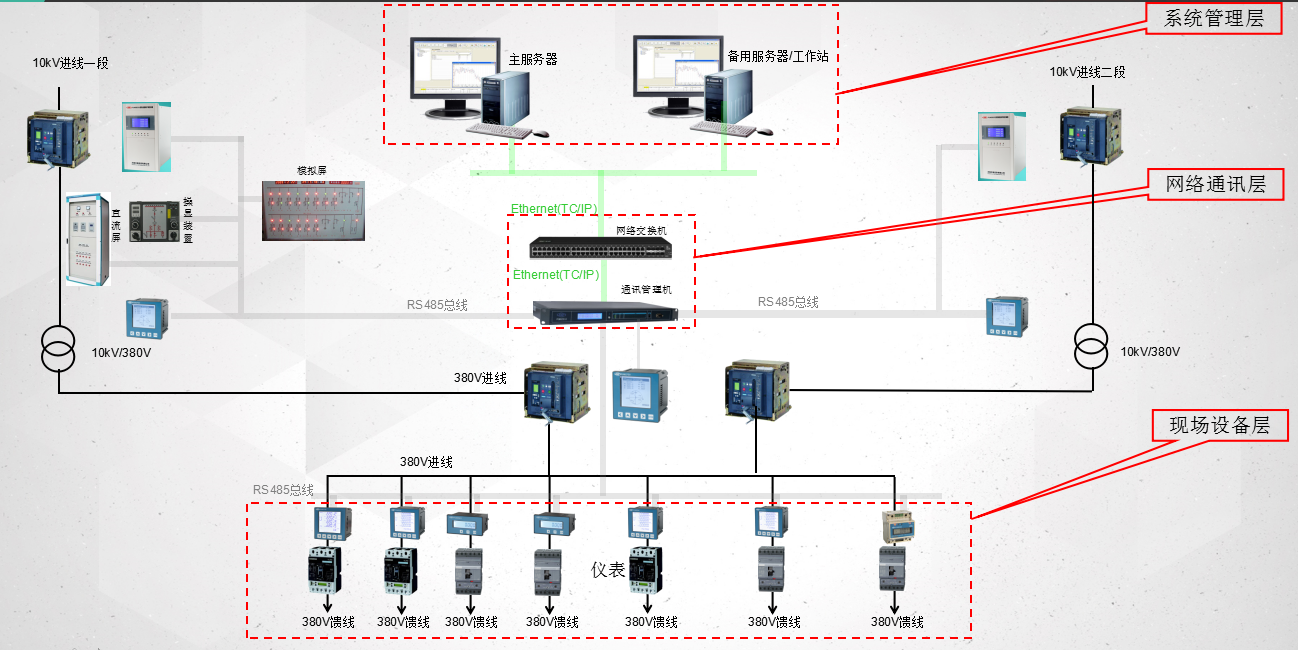康派智能的電能管理系統主要應用于35kV及其以下電壓等級的變配電室。電網中對電壓等級的分類:中壓是指35kV 、10kV、低壓是指660V、380V。在電能管理系統中,系統根據功能與結構可劃分為三層,分別是系統管理層、網絡通訊層、現場設備層。