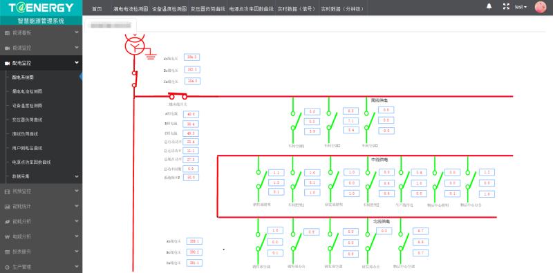 3. 配電監(jiān)控:配電監(jiān)控功能以能源管理系統(tǒng)的計(jì)量儀表及數(shù)據(jù)采集、上報(bào)的能耗數(shù)據(jù)為基礎(chǔ),實(shí)現(xiàn)對配電系統(tǒng)圖、漏電電流檢測圖等圖紙中直觀展現(xiàn)各類能耗設(shè)備的運(yùn)行參數(shù),對于觀察全部配電設(shè)備的基本運(yùn)行參數(shù)極其方便。
