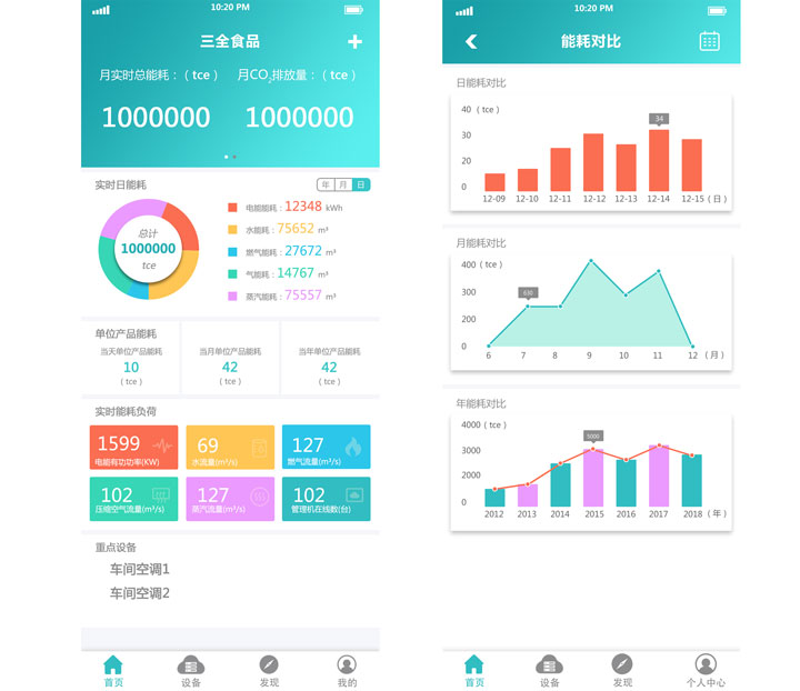 首頁主要展示企業(yè)月實(shí)時(shí)總能耗,各類能源介質(zhì)實(shí)時(shí)日能耗、實(shí)時(shí)能耗負(fù)荷等信息;可以進(jìn)行靈活切換,對(duì)比日、月、年能耗情況,并且可以添加重要設(shè)備,對(duì)其進(jìn)行重點(diǎn)監(jiān)測(cè)。