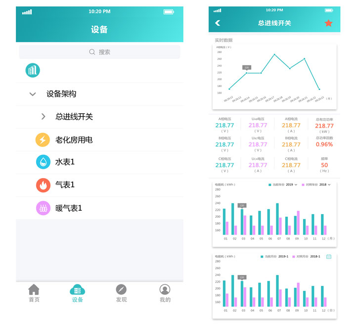 智慧能源管理系統(tǒng)App界面主要由:首頁、設(shè)備、發(fā)現(xiàn)、我的四個(gè)欄目組成。
