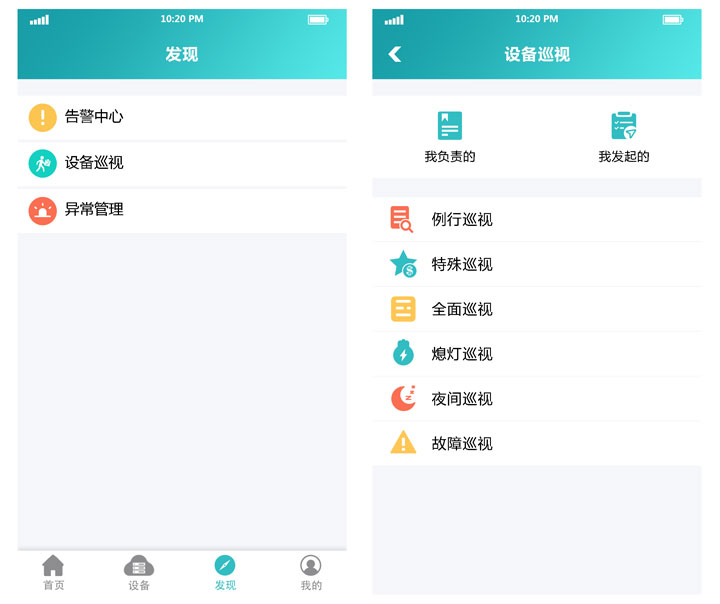 發(fā)現(xiàn)欄目側(cè)重于設(shè)備的管理以及運(yùn)維,主要涉及三部分分別是設(shè)備告警、設(shè)備巡視、異常處理;設(shè)備欄目及時(shí)推送設(shè)備告警信息,幫助運(yùn)維人員處理異常情況;設(shè)備巡視則是對(duì)巡視內(nèi)容進(jìn)行記錄與統(tǒng)計(jì);異常處理則是幫助發(fā)現(xiàn)、記錄、解決運(yùn)維過程中的不合理情況;