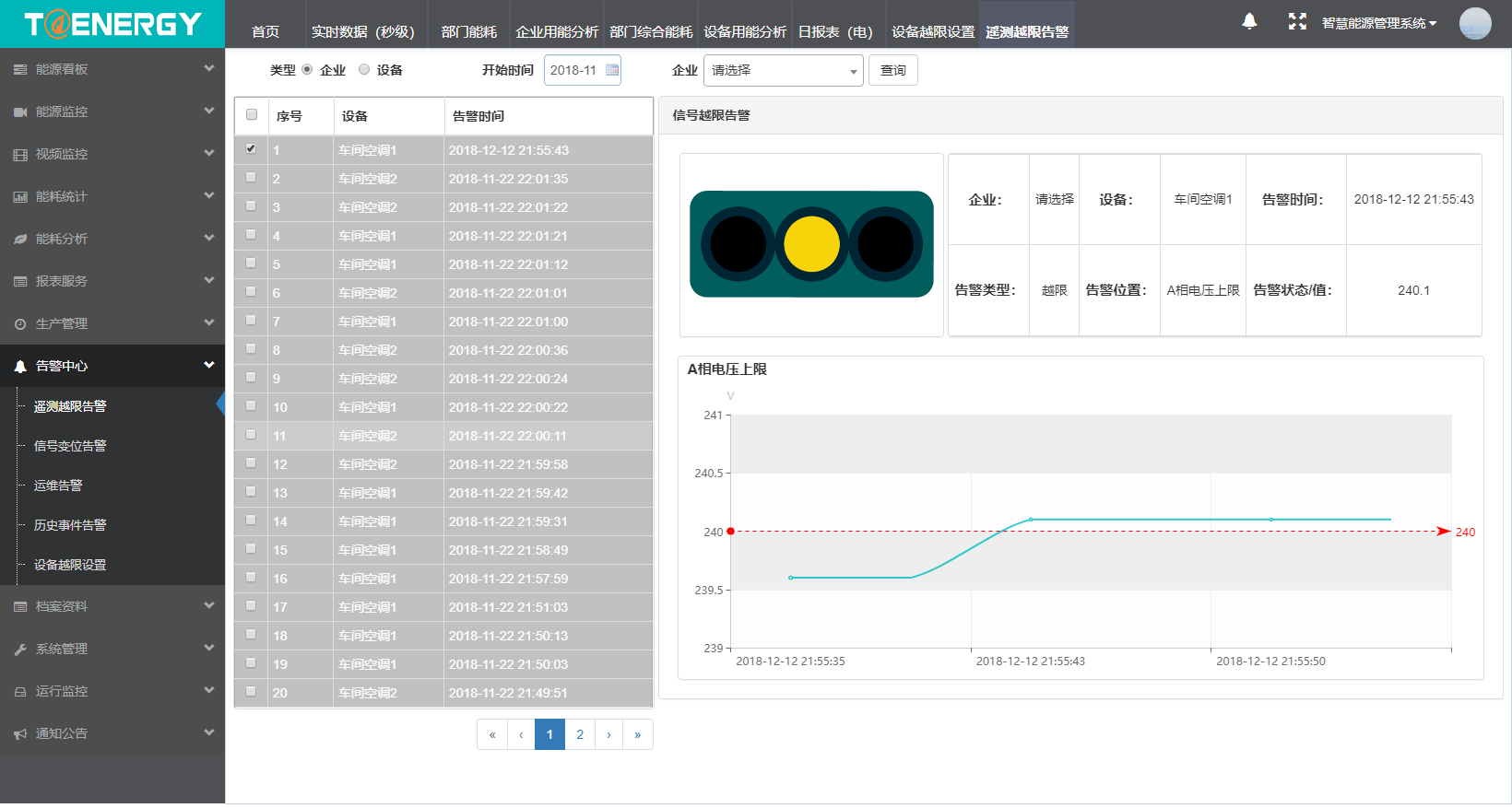 關鍵設備的故障發生是漸變到質變的過程,能源管理系統對關鍵設備的運行參數設置告警閾值,當觸及告警閾值時,通過短信、彈窗、APP的形式對告警信息進行告知,化被動運維為主動運維,幫助運維人員預防關鍵設備的故障或準確判斷故障信息,從而延長設備使用壽命、減少設備故障帶來的經濟損失。