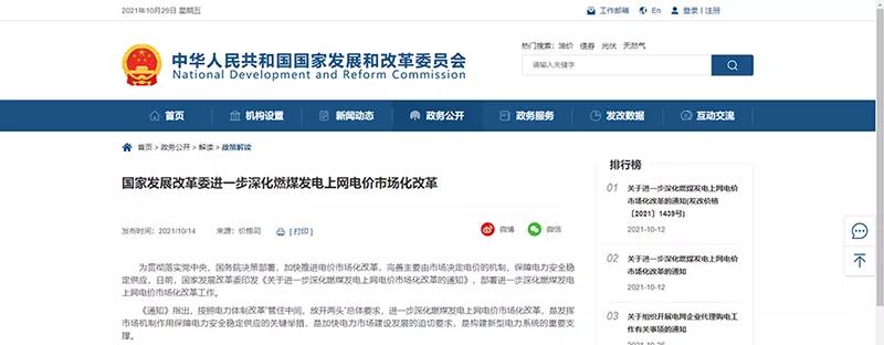 2021年10月11日,國家發(fā)展改革委發(fā)布《國家發(fā)展改革委關(guān)于進(jìn)一步深化燃煤發(fā)電上網(wǎng)電價市場化改革的通知》,主要內(nèi)容涉及四個方面: (一)有序放開全部燃煤發(fā)電電量上網(wǎng)電價。(二)擴大市場交易電價上下浮動范圍。(三)推動工商業(yè)用戶都進(jìn)入市場。(四)保持居民、農(nóng)業(yè)用電價格穩(wěn)定。