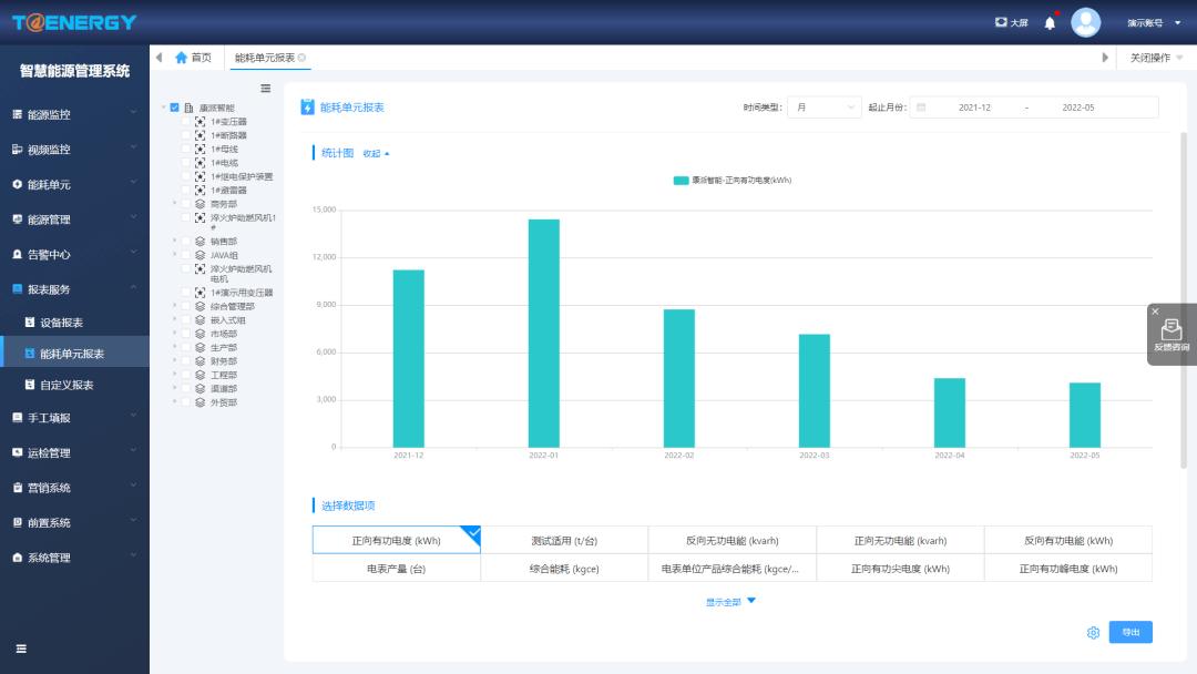 - 展示能耗單元的統計數據、經濟數據、運行數據、能耗排名、負荷分析、能效分析、力調分析、分時分析、變損分析、容需分析、碳排放分析等;