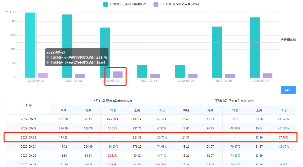 找到異常點(diǎn)。可以通過柱狀圖和圖表,發(fā)現(xiàn)9月23日的下班時(shí)間能耗要大于一周的平均能耗: