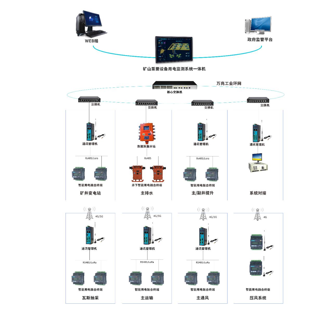 ·網(wǎng)絡(luò)層:以礦山內(nèi)部通訊管理機(jī)及相關(guān)網(wǎng)絡(luò)線路組成,通訊管理機(jī)用于末端計(jì)量表計(jì)和第三方監(jiān)測系統(tǒng)內(nèi)數(shù)據(jù)的采集、存儲、協(xié)議轉(zhuǎn)換并上傳至“管理一體機(jī)”或上級平臺 。根據(jù)監(jiān)測點(diǎn)位的數(shù)量和位置不同,可任意擴(kuò)展通訊管理機(jī)的數(shù)量。