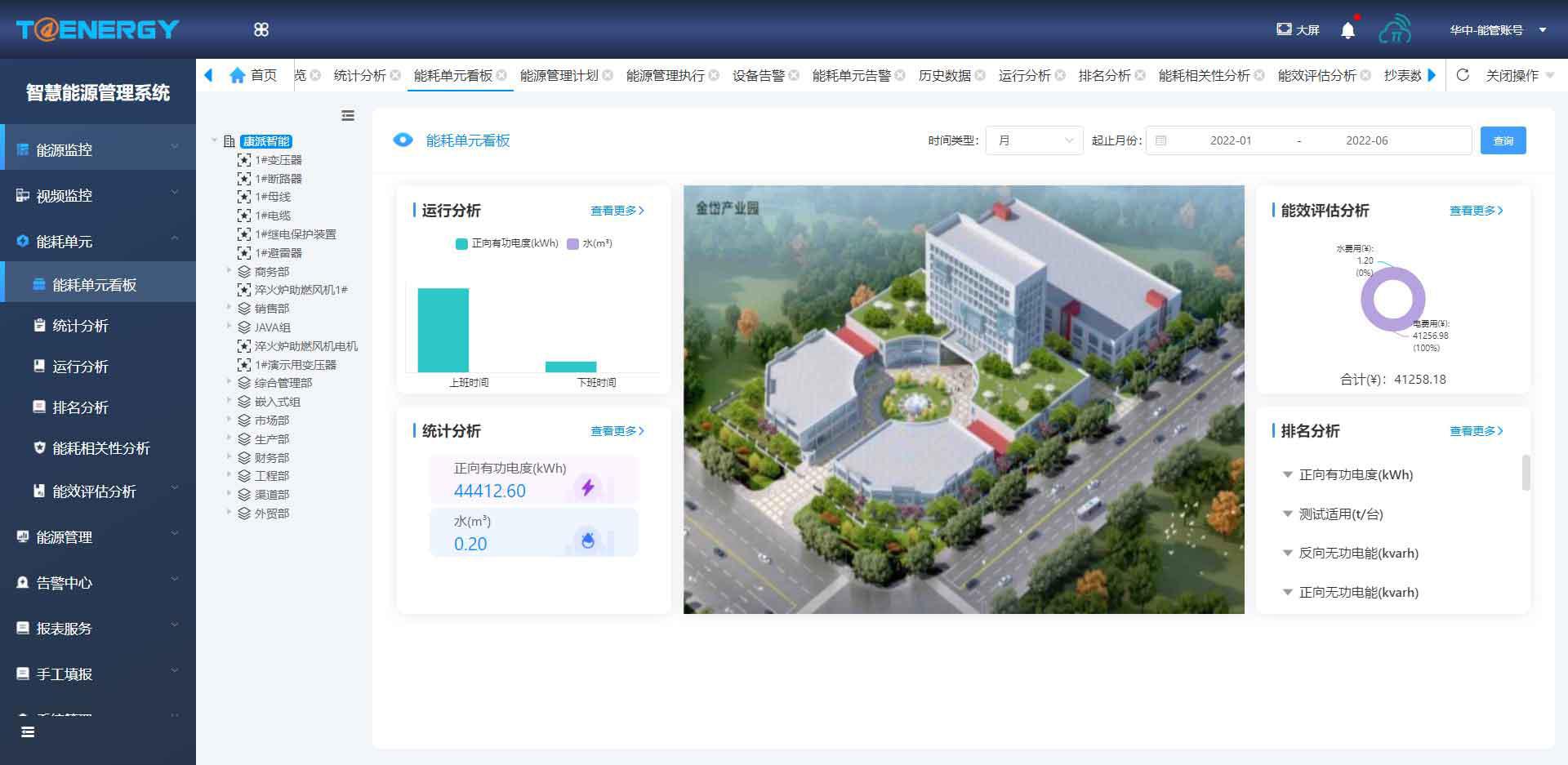 T@Energy智慧能源管理系統主要功能包括能源看板、能源監控、視頻監控、能耗統計、能耗分析、報表服務、生產管理、告警中心、設備管理等。下面主要介紹能源監控、能耗統計、報表服務、告警中心四項功能: